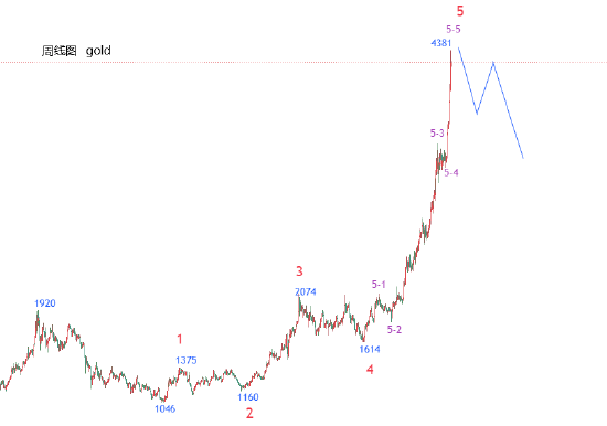 10月30日,波浪结构分析:周线图来看,上周黄金冲高4381大幅下跌至4004,我们判定黄金1046向上五波推动完成,如下图,1046-1375为一浪,1375-1160为二浪,1160-2074为三浪,2074-1614为四浪,1614-4381为五浪,五浪为延长浪,五浪内部目前大小级别结构已全部走完,后市黄金整体以4381为防守向下看调整。同级别对应1920-1046波段。也就是说,黄金接下来可能会进入慢长的调整走势。